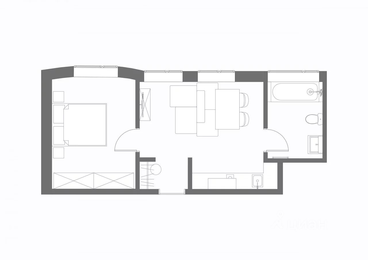 Планировка представляет собой просторную кухню-гостиную, отдельную спальню, совмещенный с/у. В квартире есть всё для комфортного проживания: широкая кровать 160х200, кофемашина, стиральная машина с функцией сушки, посудомоечная машина. Предусмотрен климат-контроль: кондиционер, приточно-вытяжная вентиляция и теплый пол по всей квартире. Четыре высоких окна делают пространство светлым и просторным.