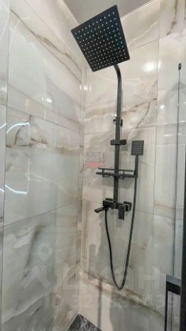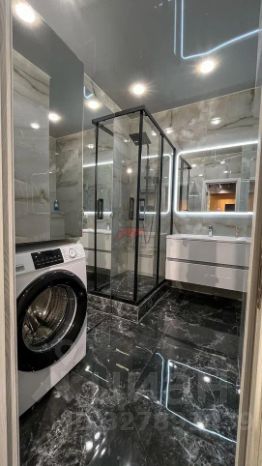 Ванная комната с душевой кабиной и качественной эстетичной сантехникой.