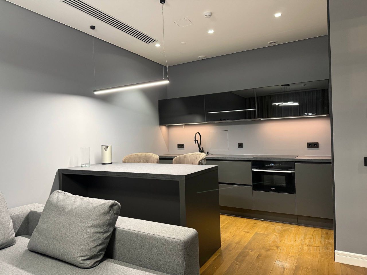 Планировка: функциональная кухня-гостиная 23 м², спальня 14 м² с системой хранения, прихожия со встроенным шкафом, санузел.