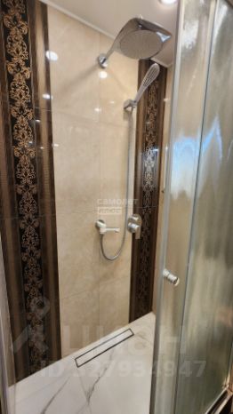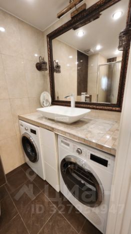 В ванной комнате вас ждет настоящий релакс: современная душевая кабина с эффектом "тропический дождь", подвесной унитаз, стиральная и сушильная машины, а также элегантное зеркало в багетной раме и стильная мраморная столешница.