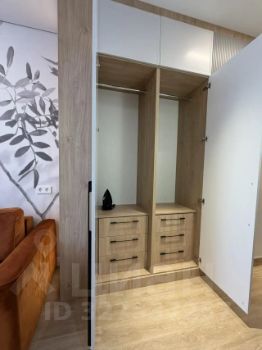 Гостиная с раскладным диваном, зонированая спальня с кроватью, душевая, прихожая с вместительными встроенными шкафоми.