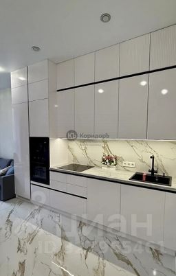 кухня-гостиная, оборудованная необходимой встроенной техникой и кухонной мебелью с подсветкой;