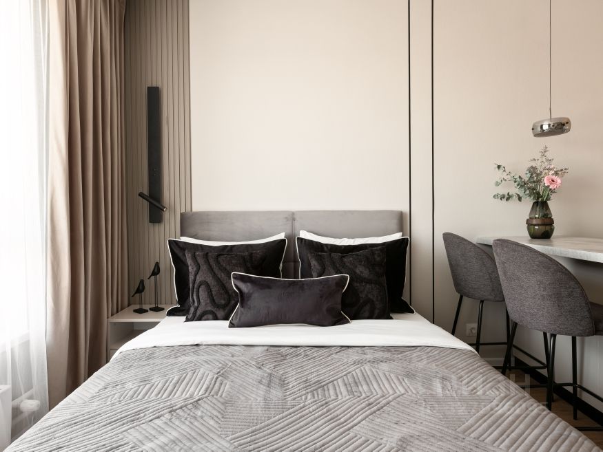 • Спальня/Гостиная: Кровать 140х200 см (HOFF) с ортопедическим матрасом Mediform, две прикроватные тумбы, комод, большой шкаф для одежды, стол для работы/обеденный, стул и кресло, стеллаж.
