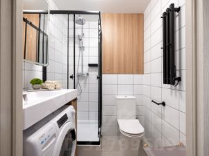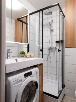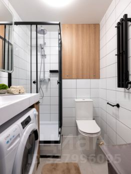 • Санузел: С душевым ограждением, полотенцесушителем, зеркалом, шкафчиками и полками для хранения. Всё необходимое для комфорта предоставлено.