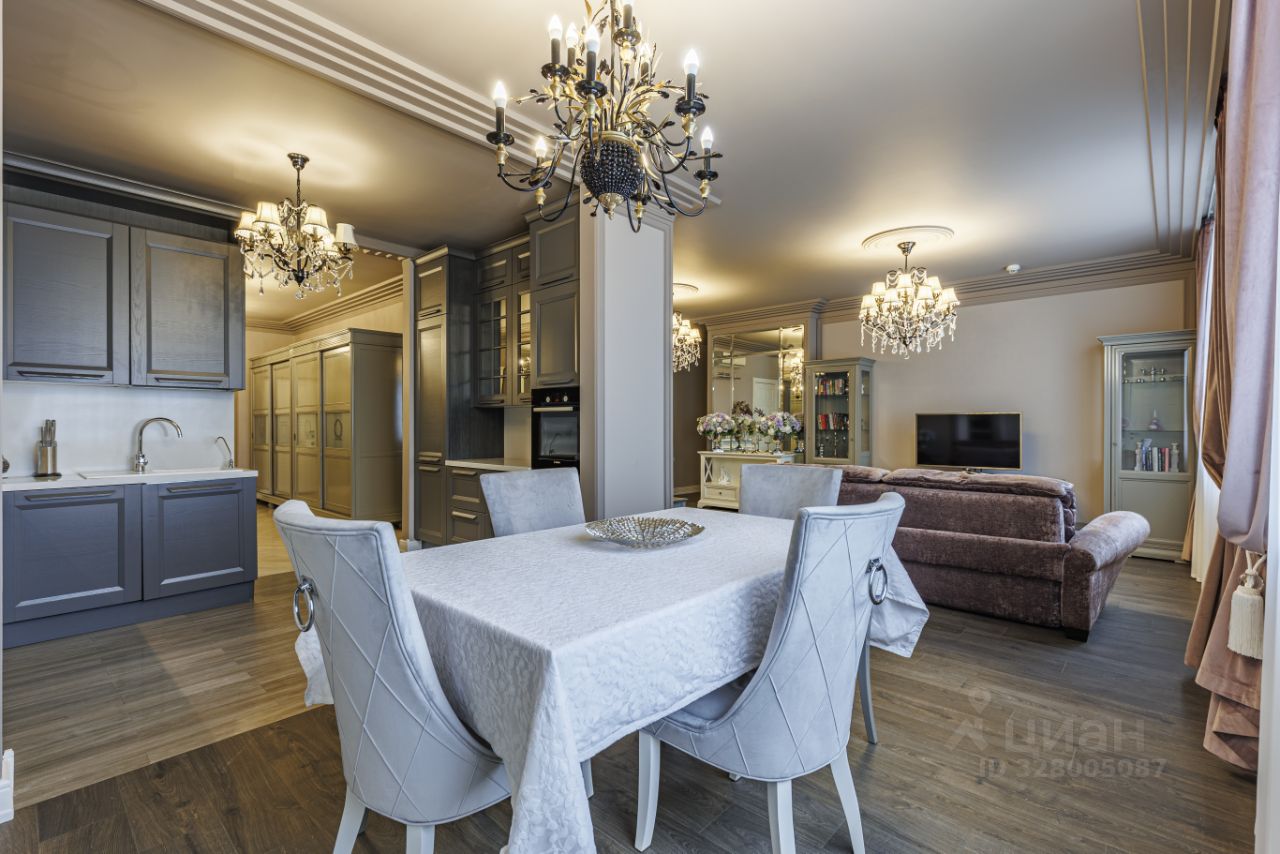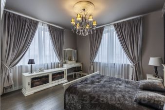 Интерьер выполнен в элегантной классике: много света, молдинги, качественная столярка, натуральный паркет, дизайнерские люстры.