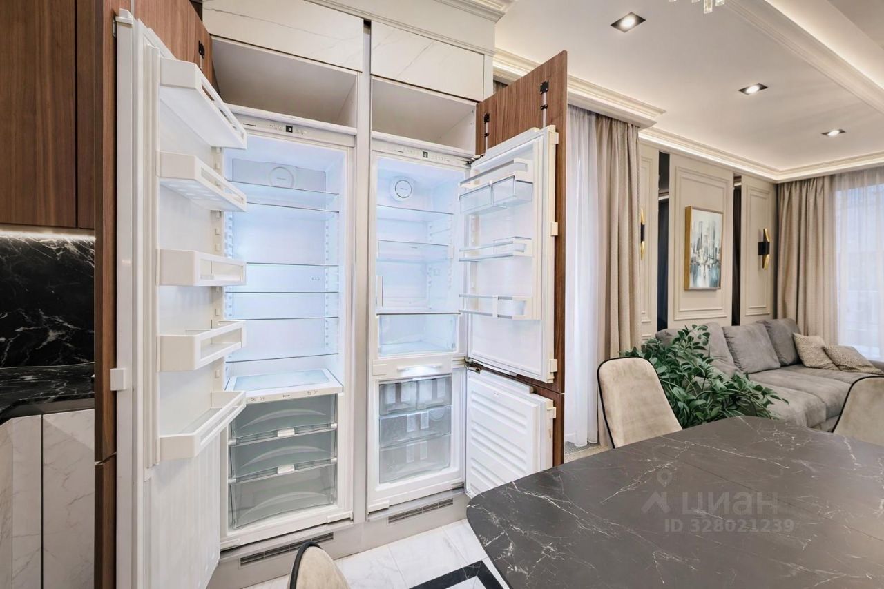 Квартира полностью укомплектована и готова к заселению: сделан дизайнерский ремонт из премиальных материалов, продуман свет, сценарии освещения и эргономика. Установлена техника: холодильник Liebherr, посудомоечная машина, кондиционеры, стиральная машина, телевизоры. Система Умный дом позволяет управлять освещением и шторами, создавая комфорт и экономя время.