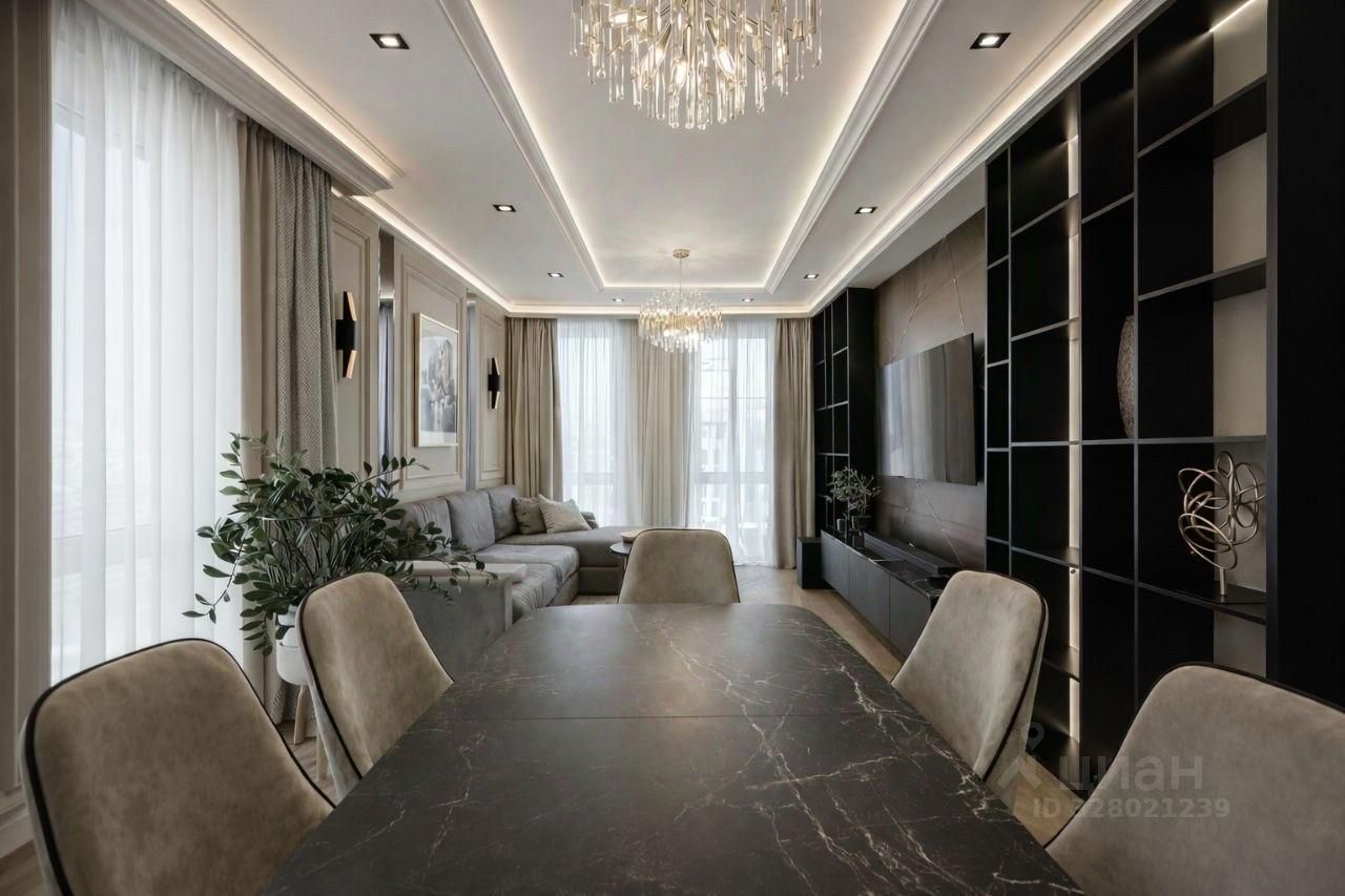 Сдаётся светлая 4-комнатная квартира 120 м² с профессиональным дизайнерским ремонтом в ЖК Хорошёвский, 3-я Хорошёвская ул., 25к1. Планировка идеально подойдёт семье: три изолированные спальни, кухня-гостиная 20 м², два санузла, две гардеробные и продуманная система хранения по всей квартире. Окна выходят и во двор, и на улицу, за счёт чего в квартире много естественного света в течение дня.