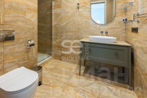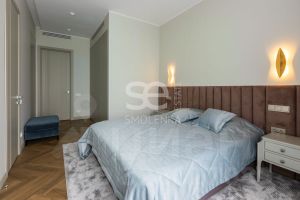 Спальня с большой двуспальной кроватью и отдельным санузлом, 2 встроенных шкафа. Прихожая оборудована встроенными системами хранения. Также при входе имеется гостевой санузел.