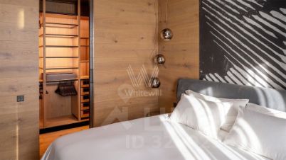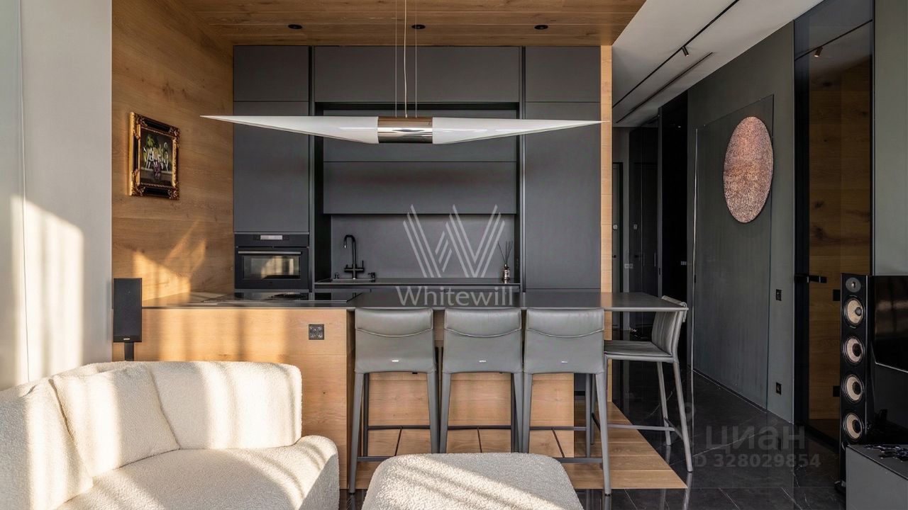 Спланирована кухня-гостиная, мастер-спальня с гардеробной, санузел, прихожая с системой хранения. Кухонная зона укомплектована техникой, включая посудомоечную машину с авто-открытием, винный шкаф, установлен смеситель с функцией моментального кипятка. Гостиная оборудована домашним кинотеатром Dolby Atmos с акустикой Focal, KEF и Bowers & Wilkins, а также телевизором Samsung. Санузел оформлен в концепции спа-пространства: душевая с тропическим душем, унитаз с функцией биде, подогрев зеркала и пола, встроенный iPad и акустика KEF. В гардеробную интегрирована панель терапии красным светом Joovv.