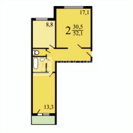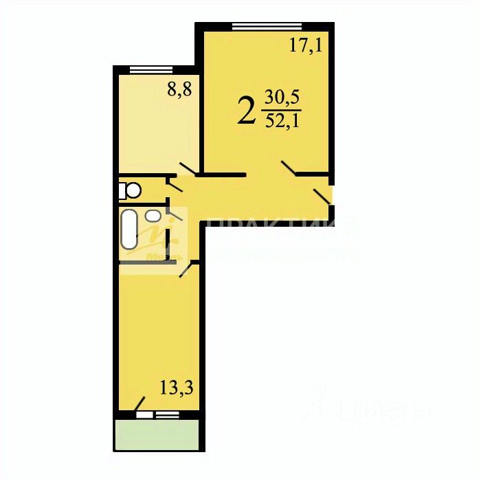 Высота потолков — 2,64 м, что создаёт ощущение простора и свободы. Квартира предлагает продуманную планировку с изолированными комнатами площадью 17,1 кв. м и 13,3 кв. м, а также кухней площадью 8,8 кв. м.