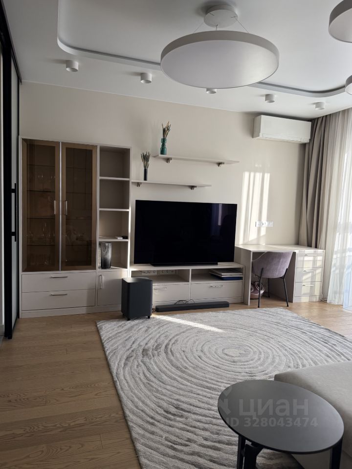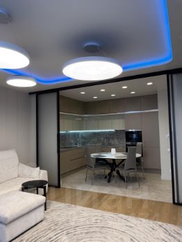 Гостиная совмещена с кухней, есть раздвижная дверь-перегородка — можно изолировать кухню, если нужно. В гостиной: диван, кресло, ТВ, два столика, рабочий стол со стулом, тумба, шкаф для посуды