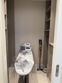 Отдельная гардеробная комната: штанги для одежды, комод, гладильная доска, парогенератор и два пылесоса Dyson (обычный и ручной)