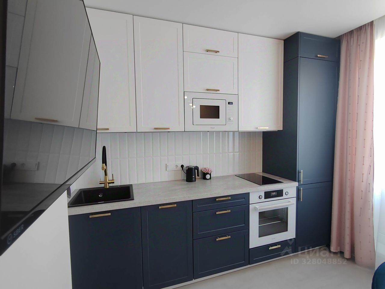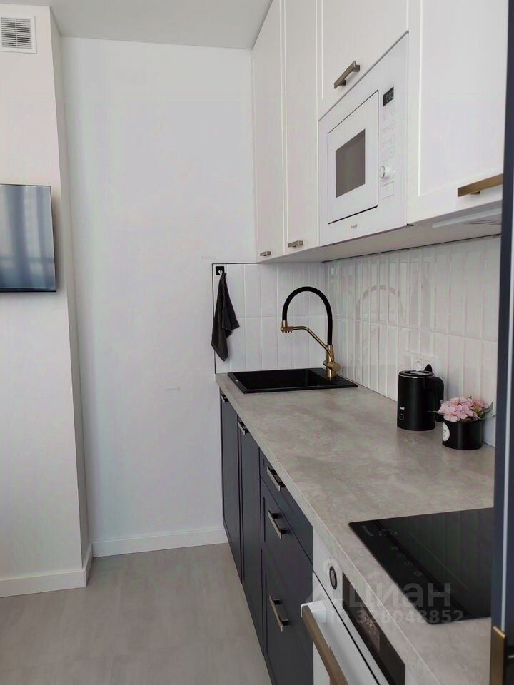 Встроенный холодильник с морозильной камерой, п/м машина, СВЧ, фильтр питьевой воды Гейзер, индукционная варочная панель, электрический духовой шкаф, вытяжка, ТВ, кондиционер . В комнате: большой шкаф, кровать 160х200 с ортопедическим матрасом, 2 тумбы, ТВ, письменный стол, кресло, кондиционер. В прихожей большой вместительный встроенный зеркальный шкаф, пуфик, вешалка для одежды. В квартире две лоджии: на кухне и в комнате (застекленная, с подогреваемым полом и шкафом).