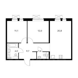 - Евротрёшка (кухня-гостиная 20,8 м²) + 2 санузла (один совмещён с ванной).