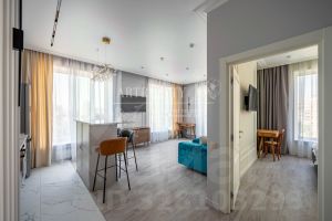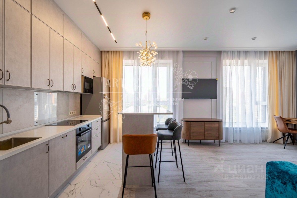 Планировка: Кухня-гостиная с островом, две спальни, ванная комната с санузлом, гостевой санузел и большая гардеробная 6м.