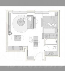 - Основная часть квартиры — просторная гостиная, с электрокарнизами для штор, Центральная зона для жизни, встреч, работы и отдыха, модульный диван с глубоким сидением, круглый ковёр, ТВ, широкий проход и глубокая посадка
