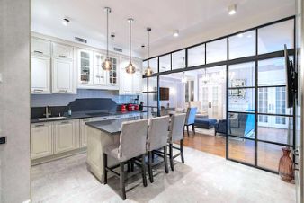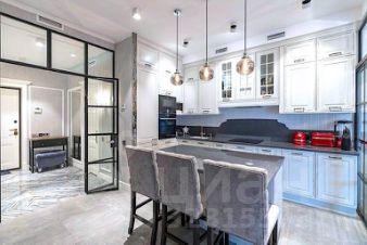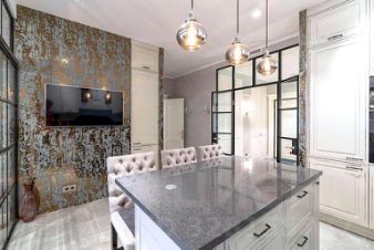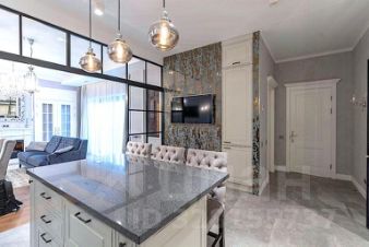 - Полностью оснащённая кухня: встраиваемая техника, остров, столовая группа.