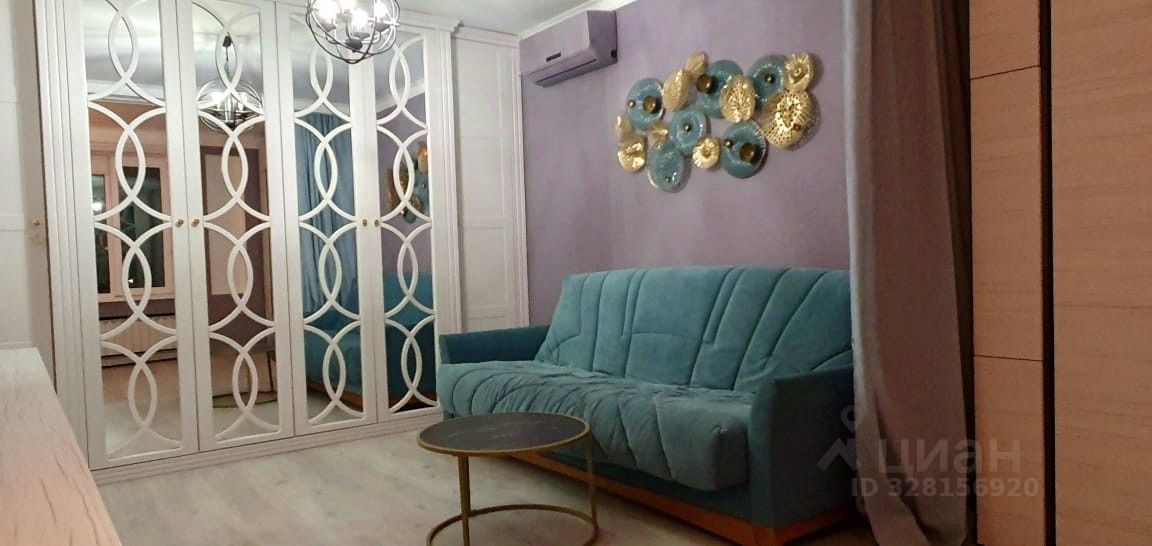 В гостиной- спальне зеркальный шкаф, раскладывающийся диван и мебель- трансформер для быстрого преобразования спальни в уютную гостиную: откидная двуспальная кровать со встроенным светом, розетками и полочками , комод- стол.