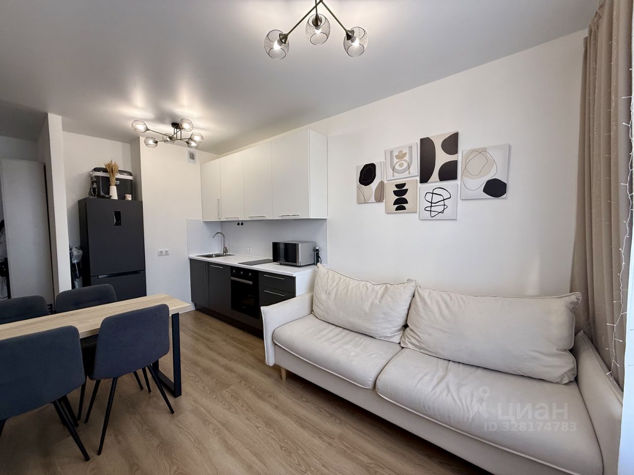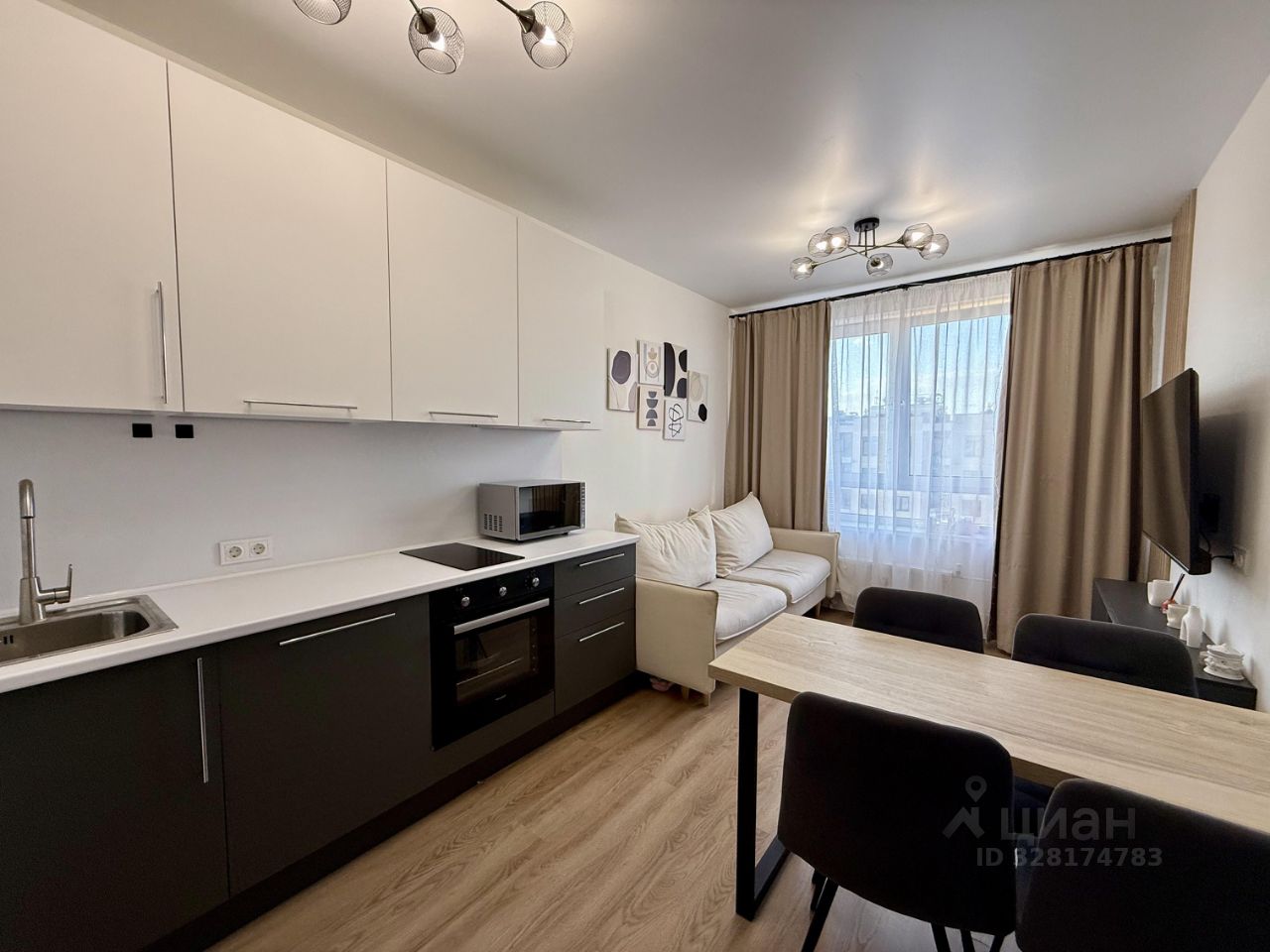 Кухня: Полноценный кухонный гарнитур, холодильник, варочная поверхность, духовой шкаф. Есть посуда для приготовления пищи и сервировки.