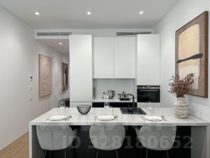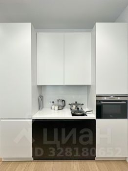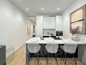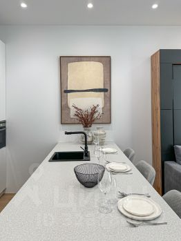 Кухня оснащена варочной панелью, посудомоечной машиной, СВЧ, духовым шкафом, сушкой для посуды, вытяжкой, двухкамерным холодильником и тремя барными стульями.