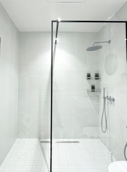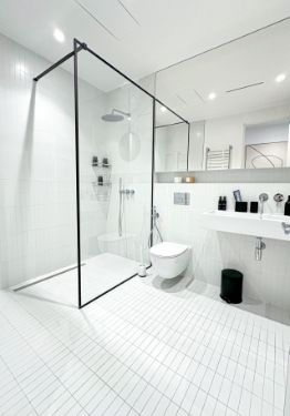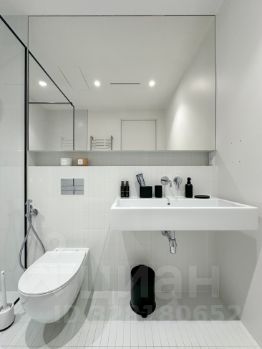 В Санузле просторная душевая кабина, большое зеркало над раковиной, полотенцесущитель и теплый пол.
