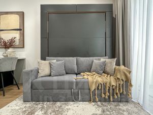 Гостиная оснащена двуспальным кроватью-трансформером, стильным журнальным столиком, пуфиком и мультимедиа .