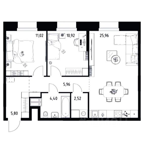 ЕВРОТРЁШКА (кухня-гостиная + 2 спальни)