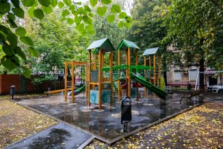 Огороженная территория, внутри хорошая детская площадка, мало машин, много зелени.два парка и т. д. Вокруг дома (очень красиво).