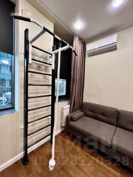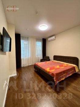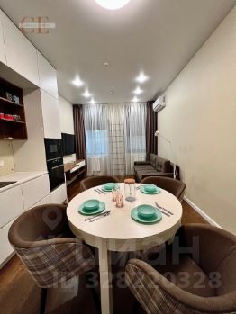 Евродвушка в комплексе бизнес-класса Хедлайнер. Гостиная, совмещенная с зоной кухни, изолированная спальня. В каждой помещении установлены кондиционеры.