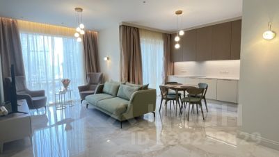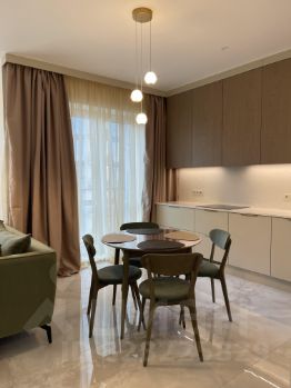 Квартира отремонтирована с применением премиальных материалов - полы инженерная доска, высокие двери на заказ, европейская бытовая техника и сантехтехническое оборудование, установлены кондиционеры, система подогрева пола, хрустальные люстры и бра, мебель из натурального дерева в спокойных природных оттенках.