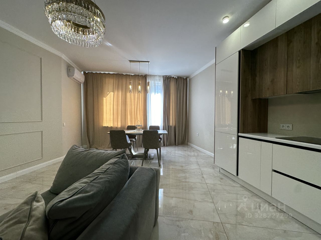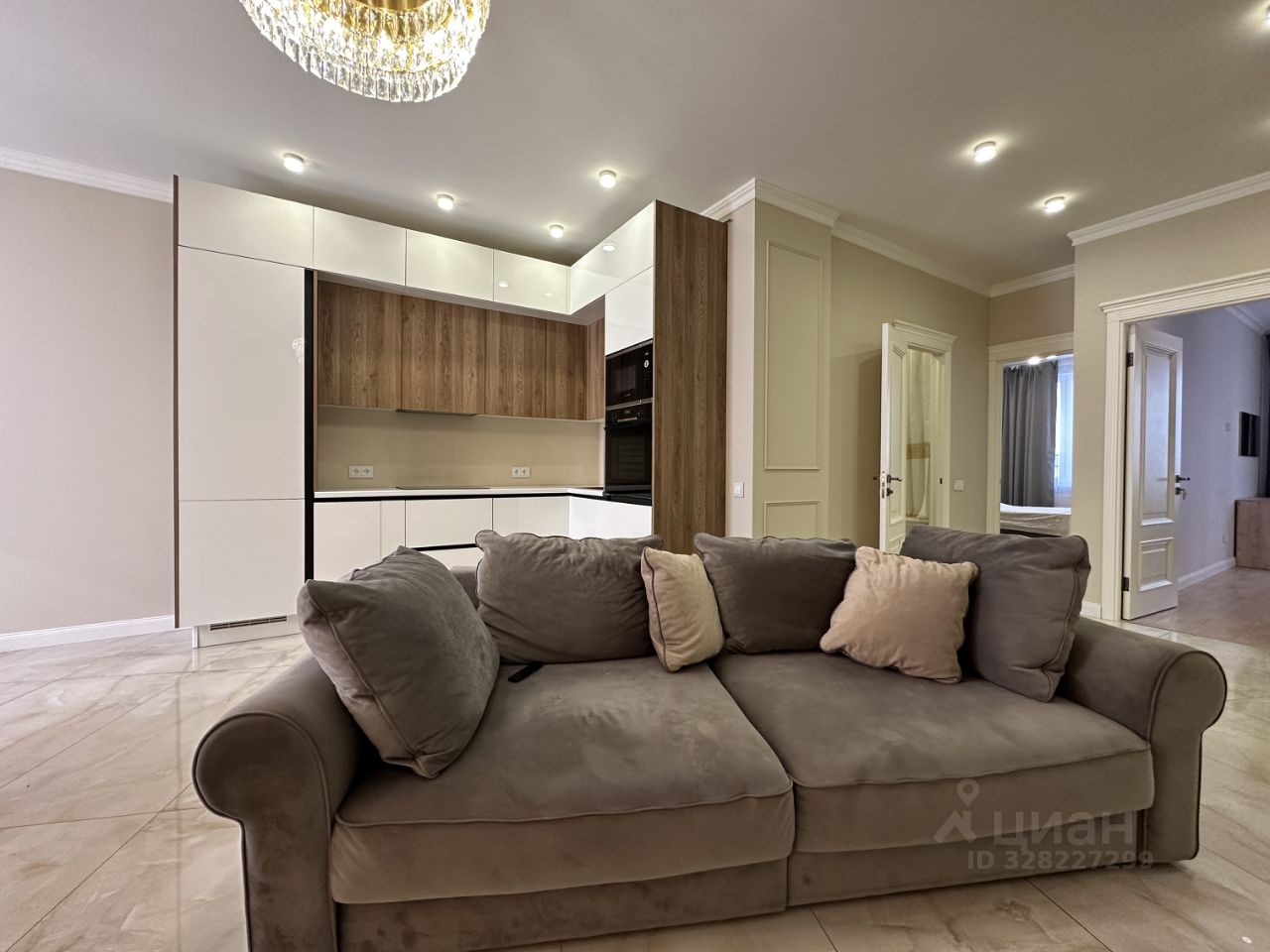 Функциональная планировка включает: просторную гостиную с выделенной зоной кухни, две изолированные спальные комнаты, в одной из которых имеется гардеробная, и совмещённая ванная.