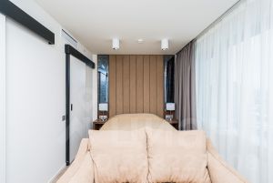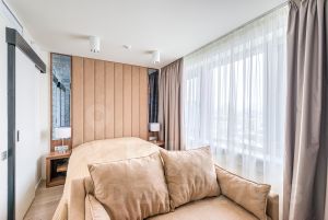 - Из удобных деталей - шторы с электроприводом: можно управлять светом в комнате одной кнопкой.