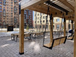 В зоне гостиной стоит большой раскладывающийся диван, перед ним небольшой телевизор. Прямо у окна мы разместили удобную обеденную группу. Окна выходят во двор, но так как они очень высоко, голоса играющих детей не будут вас беспокоить. В окнах много неба и ярких красок. Солнце приходит в квартиру во второй половине дня.