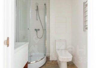 В студии совмещенный санузел с душевой кабиной, раковиной и зеркалом с подсветкой.