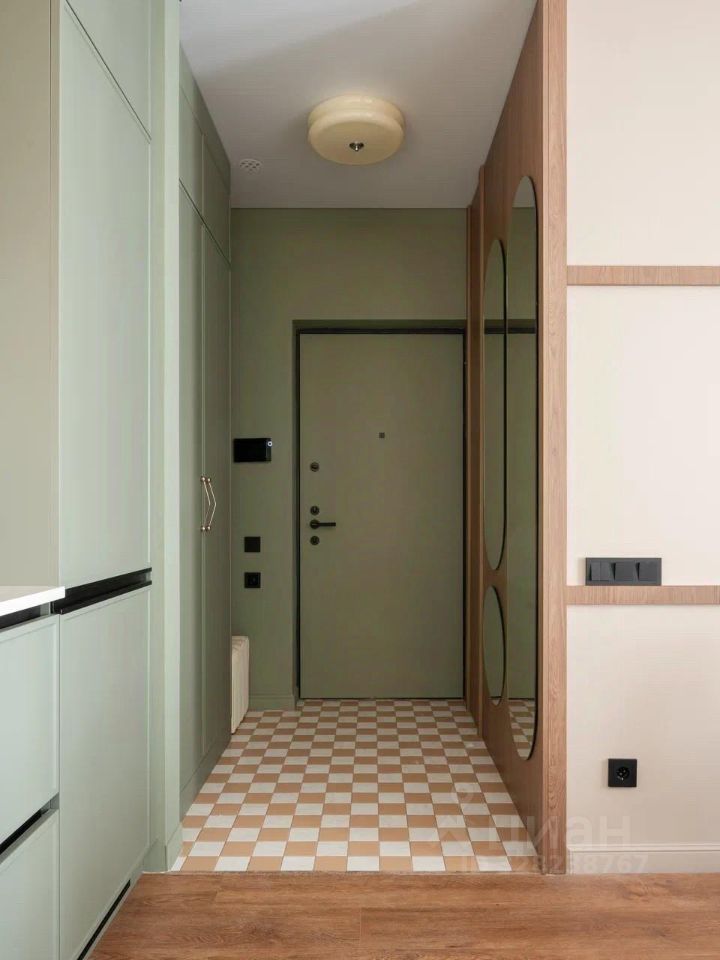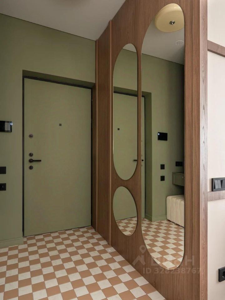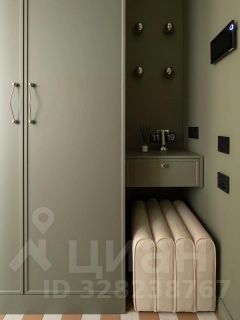 В коридоре установлен вместительный встроенный шкаф, есть пуф, зеркало в полный рост