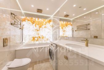 Санузел премиум-класса: отделка натуральным оником с мягкой подсветкой — эффектный акцент, создающий атмосферу спа-отеля. Сантехника Villeroy & Boch, организована отдельная постирочная зона.