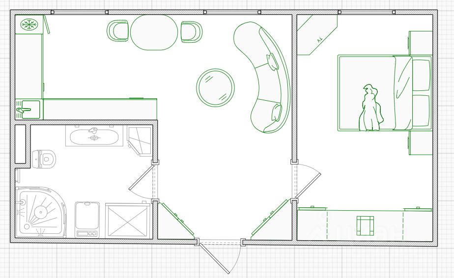 - Планировка: Просторная гостиная (18 м²), объединенная с кухонной зоной (11 м²) для приема гостей, и тихая изолированная спальня (18 м²). Просторный совмещенный санузел (8 м²)