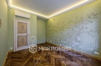 Не кричащий, а спокойный и дорогой по ощущению. Портьеры, шелкография на стенах, мягкий свет, паркет, текстиль, который собирает пространство воедино.