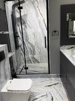 Планировка включает просторную гостиную, объединённую с кухней, спальню, санузел с ванной, гардеробную и дополнительный санузел с тропическим душем.