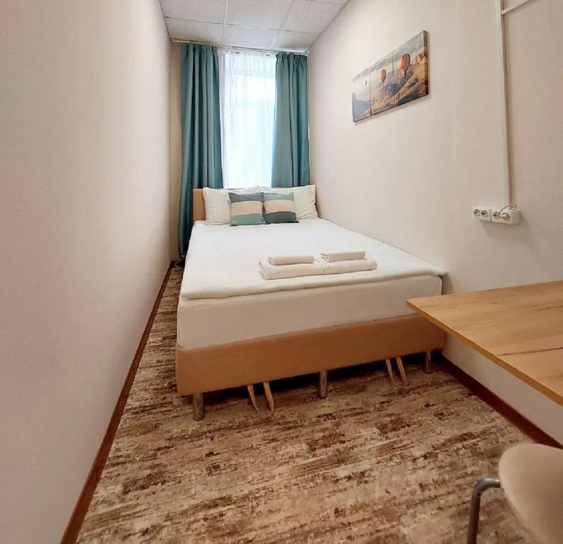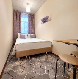 Отдельный номер площадью 8,6 м2. В номере: одна двуспальная кровать 140 см, стол, два стула, вешалка для одежды, телевизор, чайник, чайный набор. Санузел с душем, фен, туалетные принадлежности (шампунь и гель для душа, туалетная бумага, освежитель воздуха)