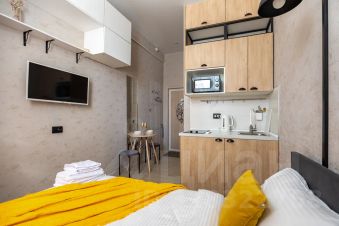 Приготовить завтрак вы сможете на небольшой, но функциональной кухне. Для этого есть все необходимое: кастрюля, сковорода, набор столовых приборов и посуда.