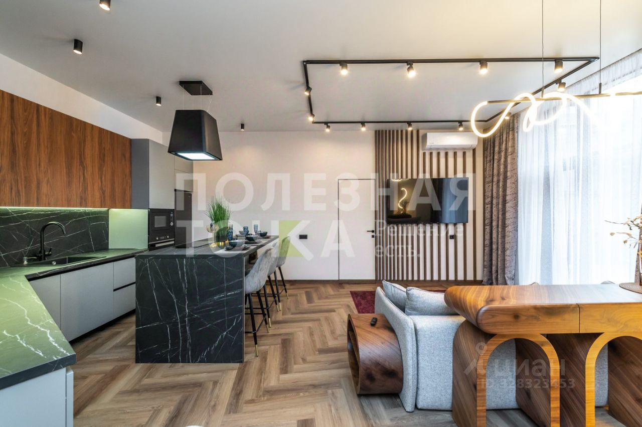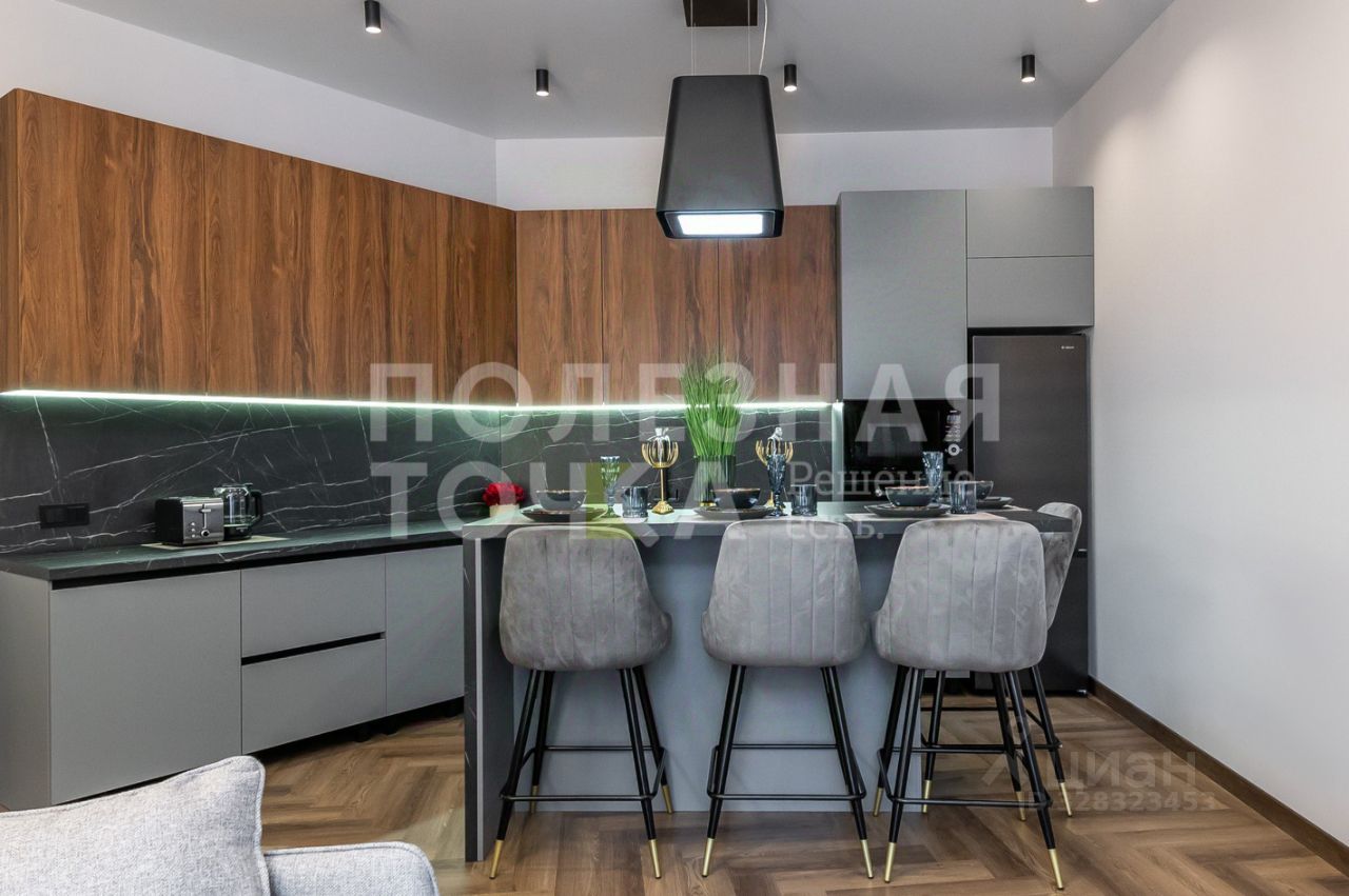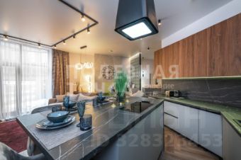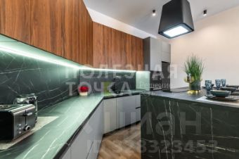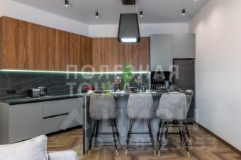 Просторная кухня из темного малахитового и графитового оттенков объемного гарнитура конусом расположена вдоль двух стен гостевого пространства, тем самым создается визуальная глубина и объем, а стол-остров, освещенный светильником-вытяжкой, разделяя его на кухонную часть и зону отдыха - гостинную. Кухня укомплектована всем необходимым: холодильник, духовой шкаф, микроволновка, варочная панель, вытяжка, чайник, тостер.