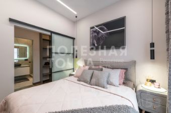Спальня с отдельной гардеробной и ванной комнатами находятся на заднем плане апартов.