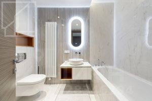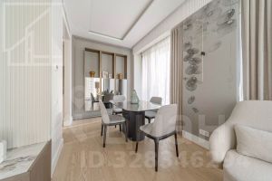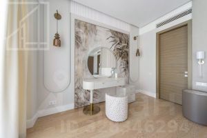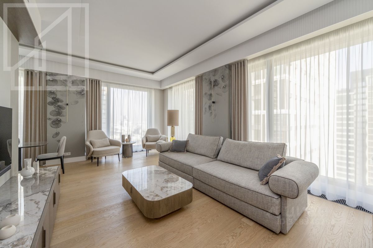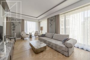 Планировка: гостиная с 4 окнами и обеденной зоной, кухня, мастер-спальня со своей гардеробной и ванной комнатой, вторая спальня со своей ванной комнатой, комната свободного назначения, гостевой санузел, холл. Квартира полностью меблирована и укомплектована техникой. Установлена система кондиционирования, стиральная и посудомоечная машины. Выполнена новая дизайнерская отделка в стиле современной классики, интерьер оформлен в приятных светлых тонах. Из окон открывается вид на город и территорию комплекса. Благодаря широким панорамным окнам и высоким потолкам пространство наполнено естественным светом.