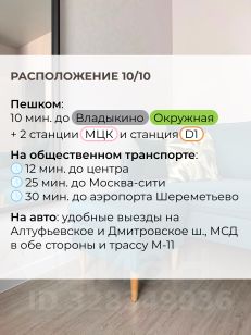 Лучшая транспортная доступность в Москве. Пешком: 10 мин. до ст.м. Владыкино (серая ветка) и ст.м. Окружная (салатовая ветка); 2 станции МЦК и станция D1. На общественном транспорте: 12 мин. до центра, 25 мин. до Москва-сити, 30 мин. до аэропорта Шереметьево. На авто: удобные выезды на Алтуфьевское и Дмитровское шоссе, МСД в обе стороны и трассу М-11.