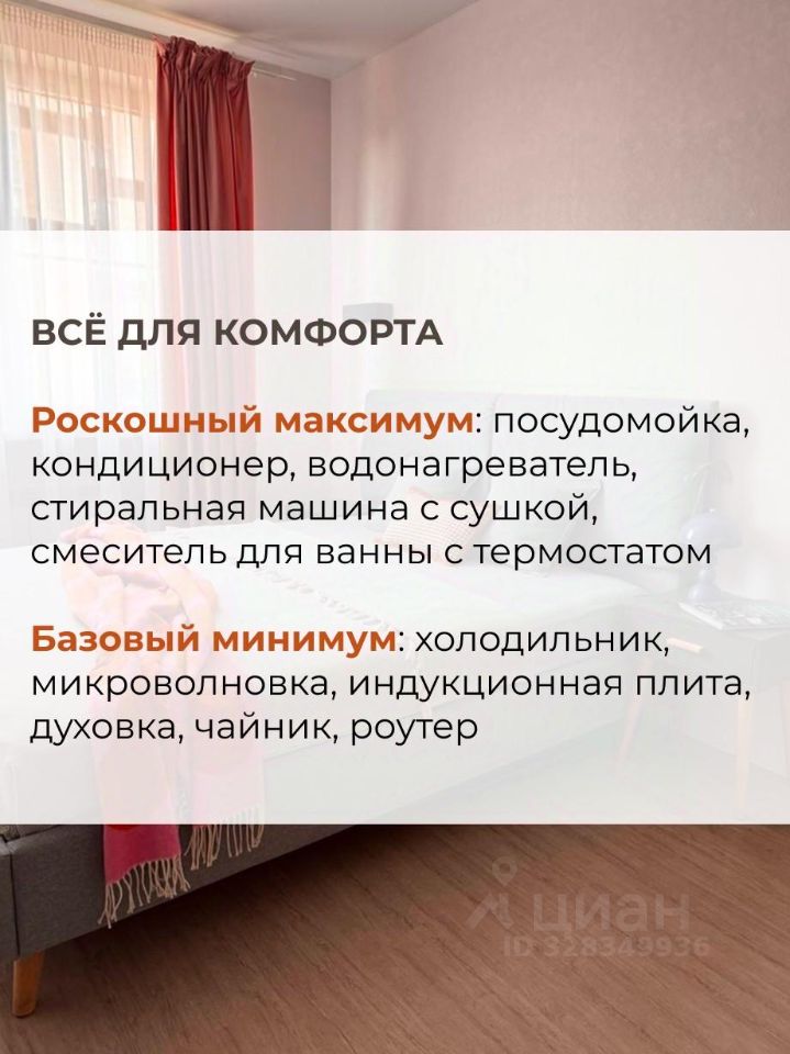 В квартире есть все необходимое для комфортного проживания. Роскошный максимум: посудомойка, кондиционер, водонагреватель, стиральная машина с сушкой, смеситель для ванны с термостатом. Базовый минимум: холодильник, микроволновка, индукционная плита, духовка, чайник, роутер.