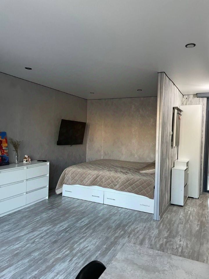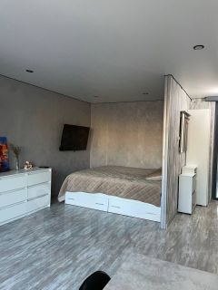 Комната: двуспальная кровать, шкаф, стол, телевизор, комод, просторная лоджия.