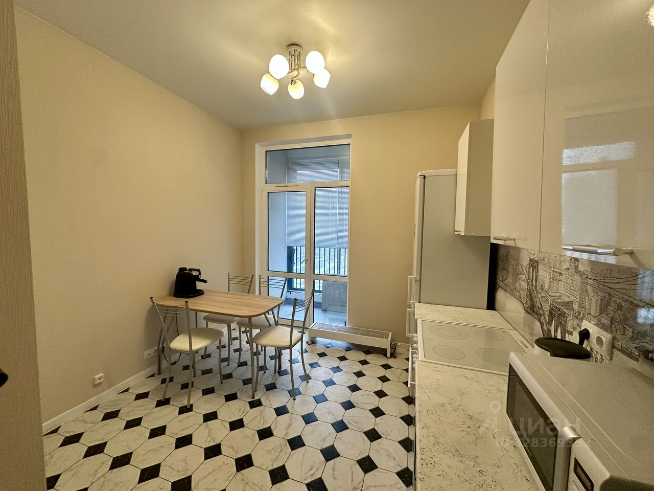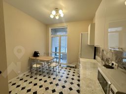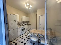 Квартира расположена на 8-ом этаже многоквартирного дома. Просторная кухня 9 кв.м. с выходом на балкон. Установлен кухонный гарнитур с необходимой техникой - электрическая плита, холодильник, мелкая бытовая техника. Кухонный стол со стульями.