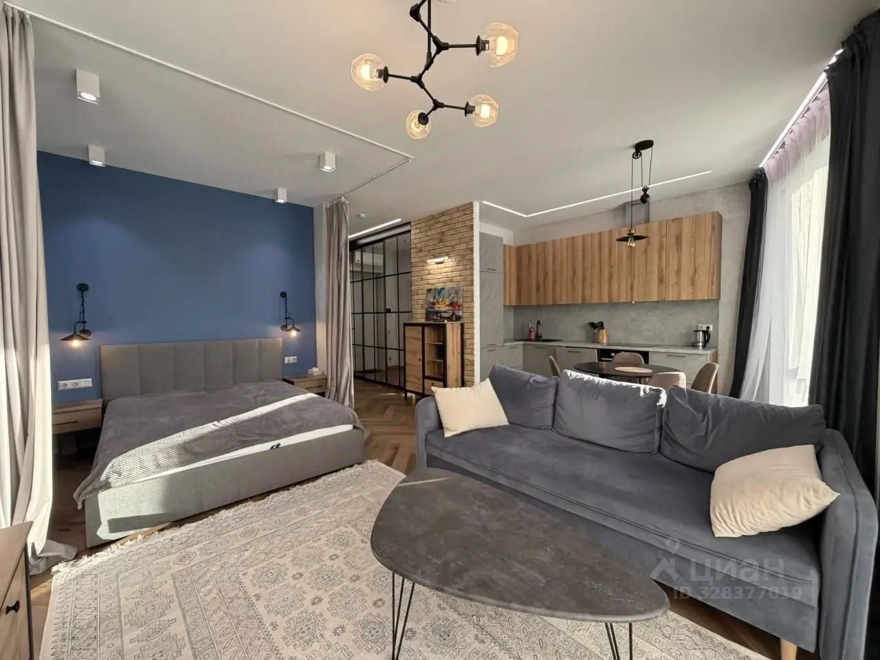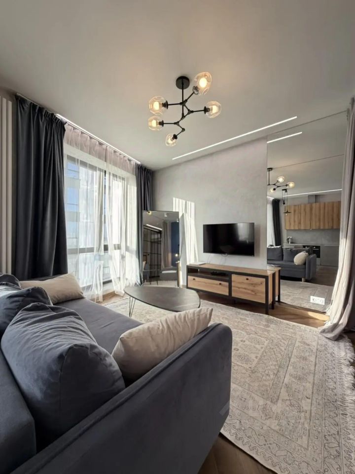 Квартира выполнена в дизайнерском стиле и полностью мебелирована. Здесь есть все необходимое для комфортного проживания: кондиционер, телевизор, стиральная и посудомоечная машины, а также холодильник. Ванная комната оборудована современной душевой кабиной. Вся мебель на кухне и в жилой комнате отлично гармонирует с общим стилем квартиры.
