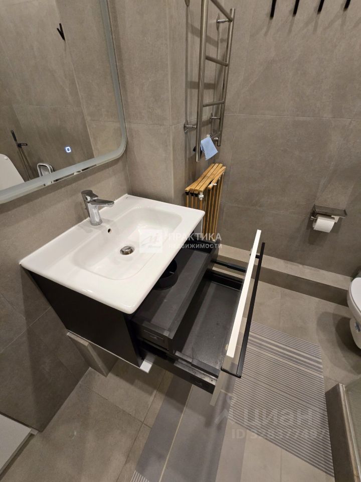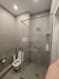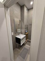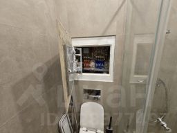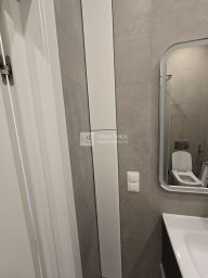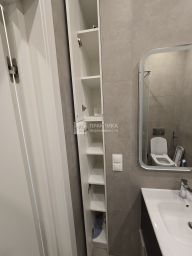 Ванная комната совмещённая, оснащена современной сантехникой, зеркалом с подсветкой, душевой кабиной и встроенным пеналом до потолка для удобного хранения.